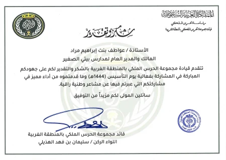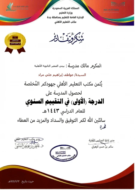 ابنتي راما أنت مفخرة للوطن ولمدارس بيتي الصغير وفقك الله أينما كنت . لك تهنئة خاصة لما حققتي من انجازات علمية مبهرة وإخلاصك لوطنك ومساهمتك في تحقيق طموح الوطن بما يتوافق مع رؤية المملكة 2030 ورؤية ورسالة مؤسسة هذا الصرح التعليمي بيتي الصغير الأستاذة عواطف ابراهيم مراد . بالفعل أنت أنموذج للتلميذة المتميزة. مديرة القسم الدولي للمراحل الدراسية العليا عائشة ابراهيم مراد . ... قراءة المزيد