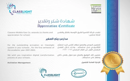 شهادة شكر وتقدير من شركة كلاسيرا لإدارة مدارس بيتي الصغير ودار المعرفة للتفعيل النوعي والمتميز لنظام كلاس لايت للتعلم الإلكتروني. ... قراءة المزيد